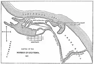 According to the Cañas-Jerez Treaty of 1858, as reaffirmed and interpreted by the arbitration of U.S. president Grover Cleveland in 1888 and by the judgment of the Central American Court of Justice in 1916 , the border between Nicaragua and Costa Rica runs along the right bank of the San Juan River, from its mouth in the Caribbean port of San Juan del Norte (formerly known as Greytown), to a point located 5 km (3 mi) downstream from an old fortification known as Castillo Viejo ("Old Castle"), originally built to guard the access to Lake Nicaragua.[9]