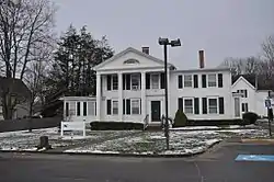 The Terry-Hayden House is located east of downtown Bristol, on the east side of Middle Street (Connecticut Route 229), just south of its junction with Pine Street. It is set well back from the road, separated from it by open space and the parking lot of the accompanying modern profession office complex. It is a 2+1⁄2-story wood-frame structure, with a gabled roof and mainly clapboarded exterior. It is composed of several different sections, the most prominent being the three-bay center. It is fronted by a mammoth two-story Greek Revival temple front, with four square Doric columns rising to a full entablature and pedimented gable. The gable cornice is studded with modillions, and it central field is filled with a semi-oval window. Windows are set in rectangular openings with projecting caps, and the main entrance is in the right bay, framed by pilasters and a corniced entablature. To the right of this bay is the 1884 addition, a two-bay frame structure with similar window styling.[2] A more modern two-story ell, also with sympathetic styling, has been to the left side.