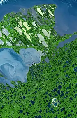 Teshekpuk Lake (Iñupiaq: Tasiqpak) is the largest lake in Arctic Alaska, at 22 miles (35 km) width on the Alaska North Slope within the National Petroleum Reserve-Alaska, South of Pitt Point, 12 miles (19 km) east of Harrison Bay, 80 miles (130 km) east of Point Barrow.[1] The Teshekpuk Lake region is considered one of the most productive, diverse, and sensitive wetland ecosystems in the entire Arctic, habitat to a variety of arctic wildlife, including the resident Teshekpuk Lake caribou herd of 64,000 animals, large numbers of shorebirds and migratory waterfowl, for whom it is an essential part of the East Asian–Australasian Flyway site network.