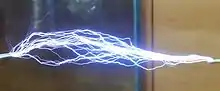 The above peak voltage is only achieved in coils in which air discharges do not occur; in coils which produce sparks, like entertainment coils, the peak voltage on the terminal is limited to the voltage at which the air breaks down and becomes conductive.[9][14][16] As the output voltage increases during each voltage pulse, it reaches the point where the air next to the high-voltage terminal ionizes and corona, brush discharges, and streamer arcs break out from the terminal. This happens when the electric field strength exceeds the dielectric strength of the air, about 30 kV per centimeter. Since the electric field is greatest at sharp points and edges, air discharges start at these points on the high-voltage terminal. The voltage on the high-voltage terminal cannot increase above the air breakdown voltage, because additional electric charge pumped into the terminal from the secondary winding just escapes into the air. The output voltage of open-air Tesla coils is limited to a few million volts by air breakdown,[5] but higher voltages can be achieved by coils immersed in pressurized tanks of insulating oil.