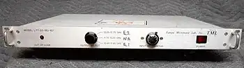 A test loop translator (TLT) is a type of radio frequency converter or heterodyne, used to translate between uplink and downlink segments (generally in the same band), to allow for "loop-back" testing and calibration of a satellite ground station without the need to interface with the satellite.[1][2] The test loop translator is an extremely valuable tool for evaluating the performance of satellite earth stations. It allows the user to carry out analysis, alignment and system testing without incurring satellite airtime costs and the risk of interfering with other satellite users. Thus, it has applications during equipment development, qualification, troubleshooting and in-service routine monitoring.[3] TLTs generally contain a fixed or preset local oscillator (LO) and a preset gain, though the LO and gain may be adjustable in some models.[1] Most models have a negative gain (i.e., signal attenuation), with -15 dB being the most common value.[1] Test loop translators can cover one or more of the satellite communication bands S, C, X, Ku, DBS, and Ka.[4][5]
