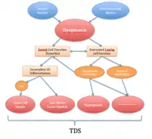 The TDS hypothesis proposes that testicular dysgenesis, which has various primary causes, can lead to abnormalities in Sertoli and/or Leydig cell function. This leads to both impaired germ cell development and hormonal changes during male sexual differentiation. For instance, insufficient production of testosterone can result in incomplete masculinisation, whilst reduced expression of insulin-like factor 3 can lead to incomplete testes descent.[12] The downstream disorders of such abnormalities can include both genital malformations (e.g. hypospadias and cryptorchidism) and delayed reproductive disorders (e.g. testicular cancer and poor semen quality) which comprise TDS.[13]
