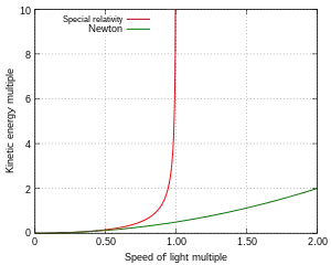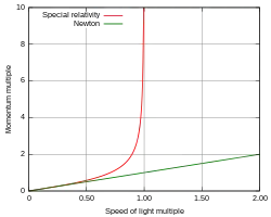 where . So relativistic energy and momentum significantly increase with speed, thus the speed of light cannot be reached by massive particles. In some relativity textbooks, the so-called "relativistic mass" is used as well. However, this concept is considered disadvantageous by many authors, instead the expressions of relativistic energy and momentum should be used to express the velocity dependence in relativity, which provide the same experimental predictions.