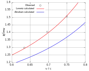 Electrons traveling between 0.25–0.75c indicated an increase of momentum in agreement with the relativistic predictions, and were considered as clear confirmations of special relativity. However, it was later pointed out that although the experiments were in agreement with relativity, the precision wasn't sufficient to rule out competing models of the electron, such as the one of Max Abraham.[3][4]