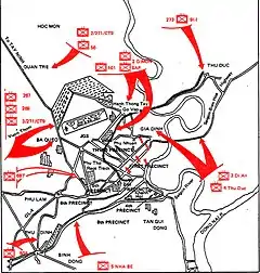 Contrary to Western belief, General Giáp did not plan or command the offensive himself. Thanh's original plan was elaborated on by a party committee headed by Thanh's deputy, Phạm Hùng, and then modified by Giáp.[58] The Defense Minister may have been convinced to toe the line by the arrest and imprisonment of most of the members of his staff during the Revisionist Anti-Communist Party Affair. Although Giáp went to work "reluctantly, under duress", he may have found the task easier due to the fact that he was faced with a fait accompli.[59] Since the Politburo had already approved the offensive, all he had to do was make it work. He combined guerrilla operations into what was basically a conventional military offensive and shifted the burden of sparking the popular uprising to the VC. If it worked, all would be well and good. If it failed, it would be a failure only for the Communist Party militants. For the moderates and centrists, it offered the prospect of negotiations and a possible end to the American bombing of the North. Only in the eyes of the militants, therefore, did the offensive become a "go for broke" effort. Others in the Politburo were willing to settle for a much less ambitious "victory".[60]