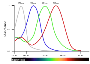 - Figure data, uncorrected absorbance curve fits, from Hart, NS; Partridge, JC; Bennett, ATD; Cuthill, IC (2000). "Visual pigments, cone oil droplets and ocular media in four species of estrildid finch". Journal of Comparative Physiology A. 186 (7–8): 681–694. doi:10.1007/s003590000121. PMID 11016784. S2CID 19458550.