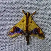 The wingspan is about 30 mm. Adults are pale yellow with brilliant red and blue patches on the wing margins.[3]