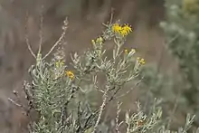 It is a bushy shrub 10–80 cm (4–31 in) tall with multibranched woody or semi-woody stems that grow from taproots. It is coated in woolly fibers with hairless strips at intervals along the branches. It has no spines. The lance-shaped leaves are no more than 4 cm (1.6 in) long and woolly or silver-haired in texture. Longer-lived leaves are alternately arranged along the stem and smaller, shorter-lived leaves occur in clusters near the axils of the primary leaves. The inflorescence bears usually three to six flower heads which are each enveloped in four thick phyllaries coated in white woolly hairs. Each head contains four tubular flowers in shades of pale to bright yellow, each 7–15 mm (0.3–0.6 in) long. Flowers are produced in May through October. The fruit is an achene 7–15 mm (0.3–0.6 in) long including its long pappus of bristles.[5][6][4]