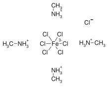 - James, B. D.; Bakalova, M.; Lieseganga, J.; Reiff, W. M.; Hockless, D. C. R.; Skelton, B. W.; White, A. H. (1996). "The hexachloroferrate(III) anion stabilized in hydrogen bonded packing arrangements. A comparison of the X-ray crystal structures and low temperature magnetism of tetrakis(methylammonium) hexachloroferrate(III) chloride (I) and tetrakis(hexamethylenediammonium) hexachloroferrate(III) tetrachloroferrate(III) tetrachloride (II)". Inorganica Chimica Acta. 247 (2): 169–174. doi:10.1016/0020-1693(95)04955-X.