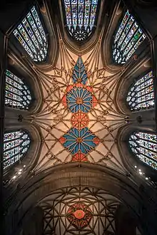 The central stone tower was originally topped with a wooden spire, which collapsed in 1559 and was never rebuilt. Restoration undertaken in the late 19th century under Sir George Gilbert Scott was reopened on 23 September 1879.[12] Work continued under the direction of his son John Oldrid Scott until 1910 and included the rood screen of 1892.[13]