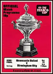 It was one of the first football competitions to receive sponsorship, taking the name of American petroleum company Texaco for £100,000, and was instituted to help promote Texaco's recent purchase of the Regent filling station chain.[3] Irish and Northern Irish clubs withdrew from the competition after 1971–72 due to political pressure,[4] competing in a separate Texaco (All-Ireland) Cup in 1973–74 and 1974–75.[5]
