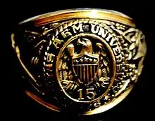 The Texas A&M Aggie ring (also simply Aggie Ring) is one of the various well-known symbols of Texas A&M University and a visible way to distinguish Aggies all over the world.[1] The Texas A&M ring was formally adopted in 1889, and its design has remained relatively unchanged since then. The only major change after the original design was a result of the renaming of the university from “Agricultural and Mechanical College of Texas” to “Texas A&M University” in 1963. The current Aggie Ring was designed by E. C. Jonas in 1894.[2][3][4] The Aggie ring has distinct physical features, is surrounded by various unique traditions, and has specific requirements for eligibility.
