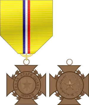 | Description | The ribbon drape is of yellow, blue, white and red stripes. The medal is a bronze cross pattée with the coat of arms of the Texas State Guard and the words "Texas State Guard" and "Service" on the obverse. The reverse contains the Coat of Arms of Texas. |