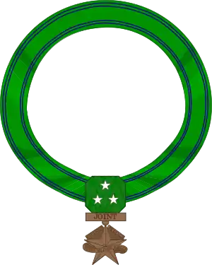 | Description | The neck ribbon is green with blue stripes near the outer edges, and three white stars. The medal is bronze in the shape of a star with the word "Joint" in a bar above it. Around the star are the words "Superior Service" and "Texas Military Forces." |