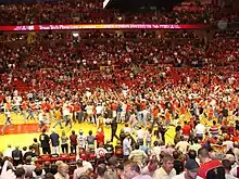 Tubby Smith was hired to replace interim head coach Chris Walker on April 1, 2013, after 6 seasons as head coach of Minnesota.[18] Smith's first season showed some signs of progress, with Texas Tech picking up its first victory over a top-25 team since 2009. Texas Tech's victory over the then #12 Baylor Bears was the first win over a ranked opponent since December 2009, when the team defeated #10 Washington.[19] Smith would later earn another top 25 upset with a victory over #19 Oklahoma State on February 8, 2014. Following outreach by Smith and the athletic department, Texas Tech students broke both school and Big 12 Conference records for student attendance at the United Spirit Arena during a February 25, 2014, loss to Kansas State. The record of 6,086 students fell less than 2,000 short of the national record.[20]
