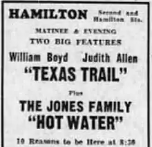 | Newspaper advertisement for the films Texas Trail (1937) and Hot Water (1937) | |