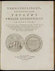 The idea was to discuss theory and present a question each year for the prize medal to be awarded. During the first ten years, only four prize medals were awarded, though five papers were published (in 1802 Jan Nieuwenhuis did not win a medal, but his paper appeared in the "Verhandelingen"). Sometimes just a gold medal was awarded, and sometimes both gold and silver medals were awarded, but often there were no contestants at all. The first gold medal winner was Martinus van Marum, who won the first prize in 1778 with his paper "Phlogisteerde en niet-phlogisteerde lucht" challenging phlogiston theory.[1] He replaced Elout the next year and became conservator of the physics cabinet.