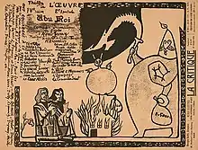On December 10, 1896, the Théâtre de l'Œuvre presented Alfred Jarry's soon legendary Ubu Roi, at Nouveau-Théâtre, 15, rue Blanche, with actor Firmin Gémier in the title role. Jarry had finished this epochal play about human greed, cowardice, and stupidity just six months before it would shock the audiences with its unapologetic opening line, "Merdre" and its playfully theatrical, marionette-like performance style. Though Jarry affected an attitude of political indifference, his revolutionary ideas challenged assumptions about society, propriety, and existence. Brockett notes that "Ubu Roi shows in all its grotesqueness a world without human decency."[4] In this lithograph announcement by Jarry for the premiere of Ubu Roi, the obese, tyrannical King Ubu appears as a shadow puppet with a segmented arm. He brandishes a scimitar in one hand and clutches a sack of gold in the other.