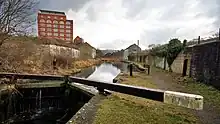 The final section of the canal before it joins the Stroudwater Navigation presented particular problems for restoration, as the channel had been used as part of a flood relief scheme by the Environment Agency. Water from the Slad Brook, which is culverted beneath Stroud, joins the canal a short distance above Lower Wallbridge Lock. The Painswick Stream and Ruscombe Brook join the channel below the junction and flow through the Dudbridge locks, after which the water is discharged into the River Frome below the A419 Dudbridge Road bridge. As a consequence of its flood relief function, the channel here is classified as a "main river".[35] Designs for reinstatement of the canal had to accommodate large flows on this section, and include underground bywash culverts, capable of carrying the full flood flow of the streams.[36]