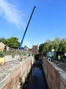 In 2002 British Waterways bought the lock at Inglesham and the adjacent round house, to safeguard the route of the canal. After they pulled out of the restoration scheme, they sold the house, which was bought by a member of the Cotswold Canals Trust, and transferred the ownership of the lock to the Trust.[48] In June 2010 the Inland Waterways Association (IWA) mounted a national campaign for £125,000 to enable Inglesham Lock and around 420 yards (380 m) of the pound above it to be restored.[49] Work on the refurbishment of the lock structure began in 2016 and was completed in May 2019, with some tidying up of the site continuing until September.[50]