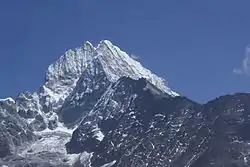 Thamserku is a mountain in the Himalayas of eastern Nepal. The mountain is connected by a ridge leading eastward to Kangtega. Thamserku is a prominent mountain to the east of Namche Bazaar and lies just north of Kusum Kangguru.