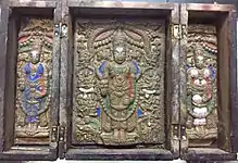 The differences are largely in the techniques used to create these artworks and in their distinct iconography.[22] The techniques adopted by the Mysore artists are slightly different from those of the Tanjore School. While Tanjore School used white lime powder and powdered tamarind seeds with gum arabic on cloth stretched on wooden panels, Mysore artists used white lead powder (Makhisafeda) or Makhi Gamboge (yellow) drawn from the juice of the indigenous tree (Revana Chinni halu) on paper. The paper sometimes was pasted to a wooden board, but mostly was framed as it was. As against the high relief of the Tanjore 'Gesso' work used prominently across large areas of the painting, the Mysore school preferred low relief, in selected areas such as jewellery, clothing, and borders. The Mysore school used pure gold leaf in lesser quantity as against gold-coated silver leaf handled across larger areas in the painting by Tanjore artists. The use of glass beads, precious and semi precious stones is also very rare in Mysore paintings. More elaborate and detailed interior and exterior landscapes are featured in Mysore paintings, whereas Tanjore paintings tend to be more iconic and static. In Mysore paintings, the jewellery, costumes, architectural features, furniture, etc. reflect the contemporary style prevalent in the Mysore Palace. The throne on which Gods and Goddesses are shown seated is usually a replica of the Mysore throne in many Mysore paintings.[23]