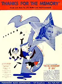 "Thanks for the Memory" (1938) is a popular song composed by Ralph Rainger with lyrics by Leo Robin.[1] It was introduced in the 1938 film The Big Broadcast of 1938 by Bob Hope and Shirley Ross, and recorded by Shep Fields and His Orchestra featuring John Serry Sr. on accordion in the film and vocals by Bob Goday on Bluebird Records (B-7318, 1937).[2] Dorothy Lamour's solo recording of the song was also popular, and has led to many mistakenly believing over the years that it was she who sang the tune with Hope in the film (in which Lamour also appeared).