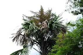 Near Ban Thap Lan, Ban Khun Sri Bupram, and Ban Wang Mued, are rare fan palm or Talipot palm forests. These forests covered much of the northeast region of Thailand in the past, though the spread of agriculture saw the destruction of a large number of palm forests. Today, Thap Lan is home to one of the few such forests remaining in Thailand. The fan palm is important in Thai culture as its leaves were used as the parchment on which Buddhist texts were inscribed.[5] Fan palms are an ancient plant that produce a single massive inflorescence, the largest in the plant kingdom, containing up to 60 million flowers. After this huge exertion of energy, the tree dies.