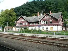 This led to the reconstruction of the whole station. In 1909 an impressive Swiss chalet style entrance building and numerous annexes were built. The network of tracks was greatly enlarged so that there were 17 tracks in the station.[4] It can be seen in old photographs that there was no platform next to the entrance building, but there were two island platforms. There was an underpass for the passengers and for baggage transfer between the entrance building and the platforms, similar to that in Freital-Potschappel.[5] A locomotive depot existed here until the electrification of the station in 1966.[6] Around 1900, two signal boxes were built at the entrances to the station from Dresden and Edle Krone, as well as the numerous outbuildings, such as the office of the head of track maintenance (Bahnmeisterei)[7] and many buildings for rail operations.[8][9]