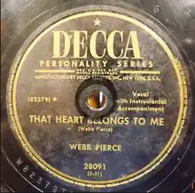 "That Heart Belongs to Me" is a country music song written and recorded by Webb Pierce. It was released in 1952 on the Decca label. In June 1952, the song reached the No. 1 spot on the Jockey chart. It peaked at No. 2 on the Juke Box chart and No. 5 on the Best Seller chart.[1] In Billboard's year-end country chart for 1952, it ranked No. 20.[2]
