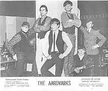 The Aardvarks, from Muskegon, Michigan, rose out of the ashes of a previous group, the Hitchhikers whose membership included lead vocalist Daryl Dingler and drummer Garey Walker, who would go on to go on to form the new band in late 1964.[1][2][3] Initially, the lineup consisted of group leader Dingler on lead vocals and Walker on drums, along with John Carter and Rick Spatt on guitars.[1][4] After Spatt departed for college, the band decided that it needed keyboards, so Dingler asked Rick Kuerth to join on organ.[1] Kuerth played classical piano and knew Gary Walker at high school, where they both played percussion in the marching band.[1] According to Kuerth, "I never considered us a 'garage band'. Yes, we originally rehearsed in Garey's basement, but he did not even have a real garage. One of the first things Chuck did was to rent us a building for us to rehearse in (our rehearsal hall). We never played in a garage, except once at my house. We were able to play as loud and long as we wanted and didn't bother anyone."[1] The band needed a bass player an eventually found Terry Potts to fill the role.[1] According to Kuerth, "I see myself and Terry as being part of an evolution in Darryl's vision for the group that really worked out quite well."[1]