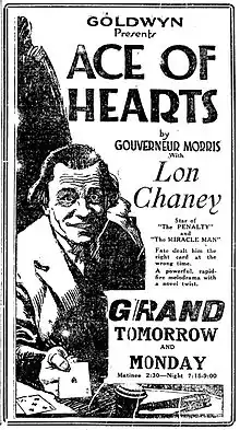 The Ace of Hearts is a 1921 American crime drama film produced and directed by Wallace Worsley. The screenplay by Ruth Wightman is based on the pulp novel The Purple Mask by Gouverneur Morris.[1] The film stars Leatrice Joy, John Bowers, Raymond Hatton and Lon Chaney. One unique feature of this film is that the main title of the movie isn't written on the screen; rather an Ace of Hearts card is shown in its place instead.
