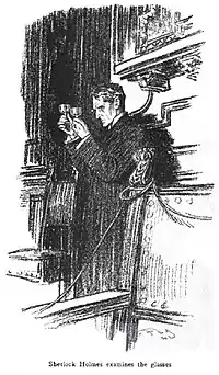 ![]() Holmes examines the corpse, 1904 illustration by Sidney Paget in The Strand Magazine | |