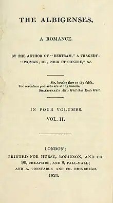 The Albigenses is an 1824 gothic historical novel by the Irish writer Charles Maturin, published in four volumes by Hurst, Robinson, and Company in London and Constable in Edinburgh.[1] It was published in the year of his death, and was his final novel followed by the short story Leixlip Castle (1825). The plot is set in the early thirteenth century based on the Catharists of Southern France, also known as Albigenses, after the town of Albi.[2] Maturin, a Church of Ireland clergyman, was known for his Gothic novels and plays. Inspired by the success of Walter Scott's Waverley novels, he turned to historical fiction and the novel bears particular similarities with Scott's Ivanhoe.[3]