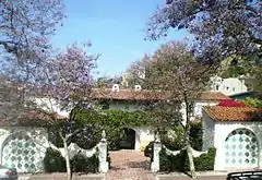 Architects Arthur and Nina Zwebell designed the structure around a richly landscaped interior courtyard.[3] Materials used reflected those commonly used in the Spanish Colonial Revival, Mediterranean Revival, Moorish Revival, and Mission Revival traditions: exposed wooden beams, cantilevered beams, carved wood, wrought iron, terracotta roof tiles, lightly textured buff-colored stucco, cast concrete, and brick.[4][5][6][7] Over the years, a cast of actors from the Golden Age of Hollywood lived at the Andalusia, including Sondra Locke, Clara Bow, Marlon Brando, Jean Hagen, John Payne, Teresa Wright, Louis L'Amour, Claire Bloom, and Cesar Romero.[2][8] Later, actor Jason Schwartzman occupied one of the units.[9] The building is located in a historic neighborhood south of Sunset Boulevard near the Chateau Marmont. The same block of Havenhurst Drive also includes two other apartment buildings listed on the National Register of Historic Places: the Colonial House (1416 Havenhurst Dr.) and the Ronda (1400–1414 Havenhurst Dr.).