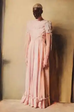 The Angel shows a tall woman who stands in front of a wall. She wears a floor-length light pink dress with short sleeves. Her blonde hair is combed back, her eyes are closed and her face is painted black.[3] The painting is in oil on canvas and has the dimensions 200 cm × 300 cm (79 in × 118 in).[4]