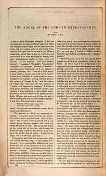 "The Angel of the Odd" is a satirical short story by Edgar Allan Poe, first published in 1844 in The Columbian Lady's and Gentleman's Magazine.