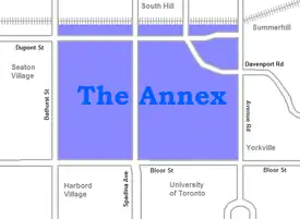 The Annex is a neighbourhood in Downtown Toronto, Ontario, Canada. The traditional boundaries of the neighbourhood are north to Dupont Street, south to Bloor Street, west to Bathurst Street and east to Avenue Road.[3] The City of Toronto recognizes a broader neighbourhood definition that includes the adjacent Seaton Village and Yorkville areas.[4]