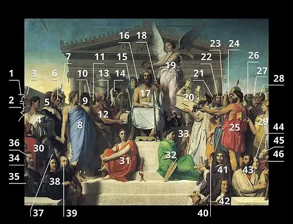 Surrounding Homer are poets, artists, and philosophers both ancient and modern—the modern personages are mostly confined to the lower register of the composition, although Ingres deemed Raphael and Michelangelo worthy of elevation to stand alongside the ancients. The figures are:[5]