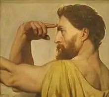 A state commission to decorate a ceiling of the musée Charles X at the Louvre (now the ancient Egyptian galleries), it formed part of a renovation project commissioned by Charles X to have himself remembered in the grand tradition of Bourbon building works at the Louvre. A condition of the commission was that it was to be completed within a year's time.[1] Upon receiving the commission, Ingres conceived the idea for his painting quickly—it was a source of pride to him that he had required only an hour to establish the broad outlines of his composition in a sketch.[1] The subsequent care he took in developing his idea is evident in more than 100 drawings and numerous painted sketches for it that survive, in which he fixed the details more and more precisely. Ingres's level of research can be seen in the painting's portrait of Nicolas Poussin, which is directly copied from Poussin's 1650 self-portrait now in the Louvre.
