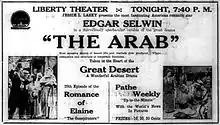 The Arab is a 1915 American silent adventure film directed by Cecil B. DeMille. Edgar Selwyn wrote and starred in the Broadway play version of the story in 1911, and this film is based on that play.[2] Selwyn reprises his role from his play.[3] This film was refilmed by Metro Pictures in 1924 as The Arab. The film is now lost.[4][5]