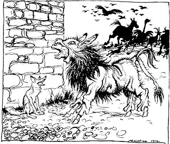 In India, the same situation appears in Buddhist scriptures as the Sihacamma Jataka. Here the ass's master puts the lion's skin over his beast, and turns it loose to feed in the grain fields during his travels. The village watchmen are usually too terrified to do anything, but finally one of them raises the villagers. When they chase the ass, it begins to bray, betraying its true identity, and is then beaten to death. A related tale, the Sihakottukha Jataka, plays on the motif of being given away by one's voice. In this story, a lion sires a son on a she-jackal. The child resembles his father, but has a jackal's howl, and is therefore advised to remain silent.[7] A common European variant on this theme appears in the Ladino Sephardic proverb, asno callado, por sabio contado: "a silent ass is considered wise."[8] An English equivalent is "a fool is not known until he opens his mouth."