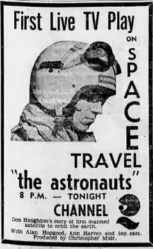 The Astronauts is a television film, or rather a live television play, which aired in Australia during 1960 on ABC. Broadcast originally in Melbourne on 18 May 1960, a kinescope recording was made of the broadcast and shown in Sydney on 27 July 1960 (it is not known if it was also shown on ABC's stations in Brisbane, Adelaide and Perth).[3] FilmInk magazine said it may be the only Australian drama about the space race.[4]