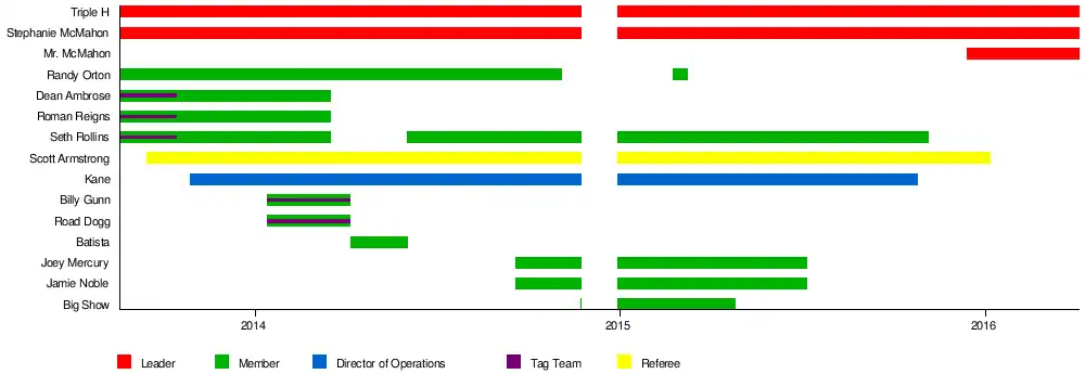 | Mr. McMahon (co-leader)[54] | December 14, 2015 – April 4, 2016 | WWE chairman and WWE Chief Executive Officer Joined after Triple H was injured at TLC: Tables, Ladders and Chairs Left after putting Shane McMahon in charge of Raw |