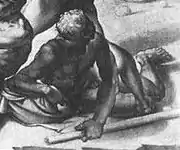 In the painting, however, none of the instruments are being played. The only instruments portrayed are the "straight flute". Two are held by the girls in the foreground, and a third is on the ground behind them and near a glass of wine, an overturned metal cup, and a tray of libations.[8]