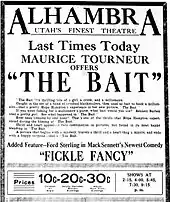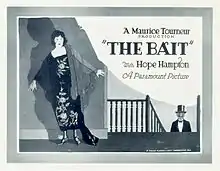 The Bait is a 1921 American silent crime drama film produced by and starring Hope Hampton, directed by Maurice Tourneur, and distributed by Paramount Pictures. John Gilbert, then working for Tourneur, wrote the scenario (silent film version of a screenplay) based on the stage play The Tiger Lady by Sidney Toler. Filmed in 1920, the picture was released a day after New Year's 1921. The Bait is now considered to be a lost film.[1][2][3]
