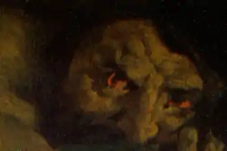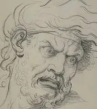 Delacroix wrote that his best painting of a head in this picture is that of the soul reaching with his forearm from the far side into the boat.[3] Both Charles Le Brun's, La Colère of 1668, and John Flaxman's line engraving The Fiery Sepulchres, appearing as plate 11 in The Divine Poem of Dante Alighieri, 1807, are likely sources for this head.[4]