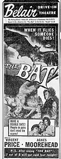 The Bat is a 1959 American crime-mystery thriller starring Vincent Price and Agnes Moorehead. It is the fourth film adaptation of the story, which began as a 1908 novel The Circular Staircase by Mary Roberts Rinehart, which she later adapted (with Avery Hopwood) into the 1920 play The Bat.[1][2][3] The first film version of the play was the 1926 American silent film The Bat. The film version was adapted by playwright Crane Wilbur, who also directed.[4]