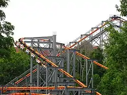 The Bat, formerly called Flight Deck and Top Gun, is a suspended roller coaster at Kings Island in Mason, Ohio. Built by Arrow Dynamics, the ride was known as Top Gun when it opened in 1993.[1][2] It is the park's second suspended coaster following an earlier prototype from Arrow Development — also called The Bat – that operated at Kings Island from 1981 to 1983.[3] The layout is designed to give riders the illusion they are narrowly missing track supports and other elements while swinging through sharp turns.