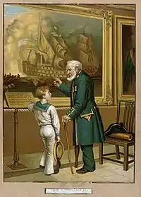 A history painting is traditionally defined as a large-scale work depicting a scene from the Bible, mythology, or classical history. Generally regarded as the height of artistic genres, Turner recognizes this and paints The Battle of Trafalgar as a history painting depicting a contemporary event and as a patchwork scene composed of different moments portrayed as being simultaneous. Turner knows the importance of this genre and employs it to further the significance of the contemporary scene. This action firmly cements the work as being of great national significance and affirms Britain as a great maritime power.[5] In the pursuit of these ideals and significance, Turner took several moments from the battle, across several days, and merged them into one moment in one scene.[1] This then represents Turner's desire to take the battle and use it to create something of general, philosophical, and national significance. This aspect, along with the pyramidal composition reference triumph and sacrifice reaffirm this work's place as a history painting, despite it not depicting one scene from ancient history, religion, or mythology.[6]